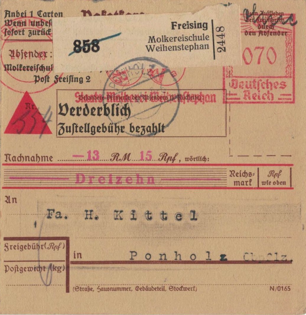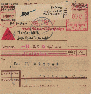 Auch bei diesem Beleg ist es für den Thematiker nicht so wichtig, auf welcher Maschine er gedruckt wurde, viel interessanter ist der Selbstbucher-Zettel mit dem Hinweis auf die Molkereischule dieses Unternehmens.