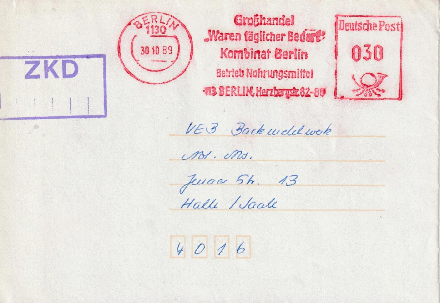 Der Fernbrief, aufgegeben in BERLIN 1130 durch das Kombinat "Waren täglicher Bedarf" - Betrieb Nahrungsmittel ist für mich bedeutender durch das Datum vom 30.10.1989, denn 11 Tage später hatte ich die Möglichkeit, auf der Mauer am Brandenburger Tor stehen zu dürfen.