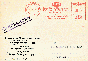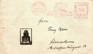 Bei diesem Beleg, versandt im August 1939 von ELMSHORN aus, kann man nicht genau feststellen, ob er seinerzeit als Mischsendung oder als Warenprobe verschickt wurde, da die Gebühr dafür die gleiche war. Im Werbeklischee ist diesmal tatsächlich ein Leuchtturm dargestellt, auf dem Umschlag gibt es eine Abbildung des Firmensitzes.