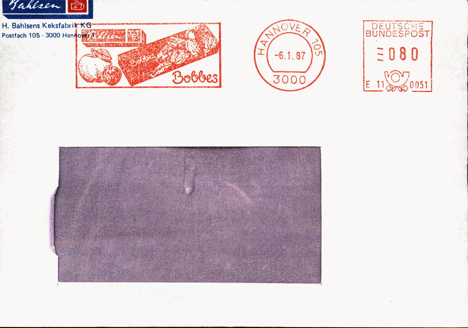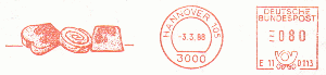 ein Freistempel der Firma Bahlsen zeigt eine Packung Kekse, einen Apfel und eine Erdbeere