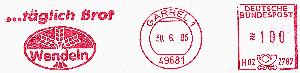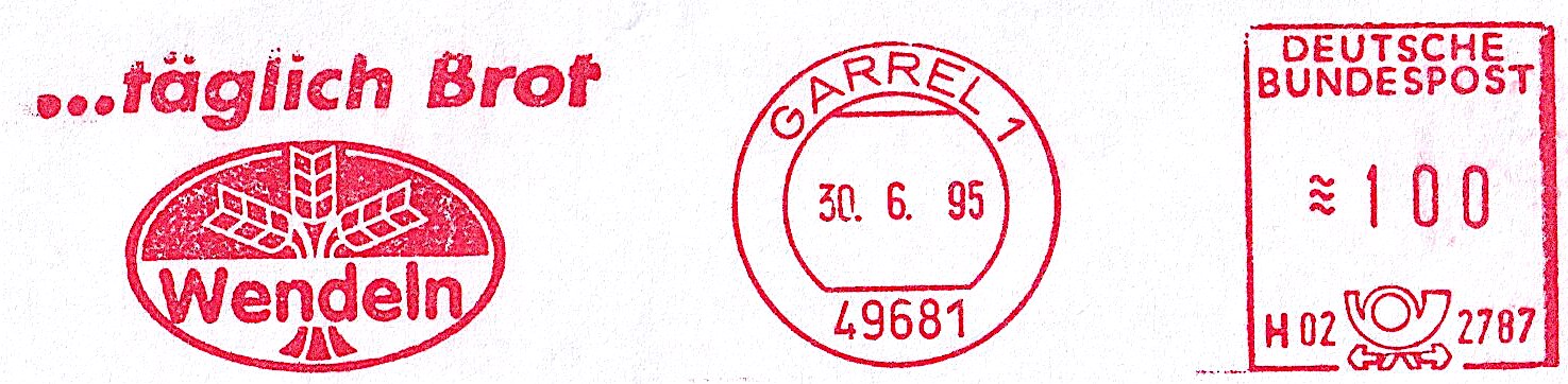 im AFS vom 30.6.1995 aus GARREL 1 / 49681 mit Maschinenkennung H022787 wird auf das wohl zu den Grundnahrungsmitteln zählende "täglich Brot" mit dem Markenzeichen der Bäckerei Wendeln aufmerksam gemacht.