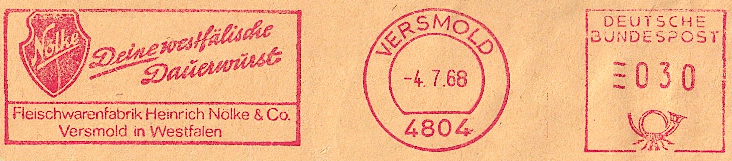 Ein Baustein des Erfolgs zeigt sich vielleicht in dem AFS vom 4.7.1968 aus VERSMOLD / 4804: Neben dem Firmenlogo Nölke prangt die Botschaft: Deine westfälische / Dauerwurst. Als Anbieter firmiert hier: Fleischwarenfabrik Heinrich Nölke & Co. / Versmold in Westfalen