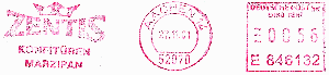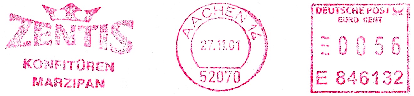 mit AFS aus AACHEN 14 / 52070 mit Maschinenkennung E846132 vielleicht ein gekrönter Begleiter zwischen Morgen und Abend: ZENTIS KONFITÜREN (zum morgendlichen Brotaufstrich) und MARZIPAN (etwas Naschzeug zum Tagesende?)
