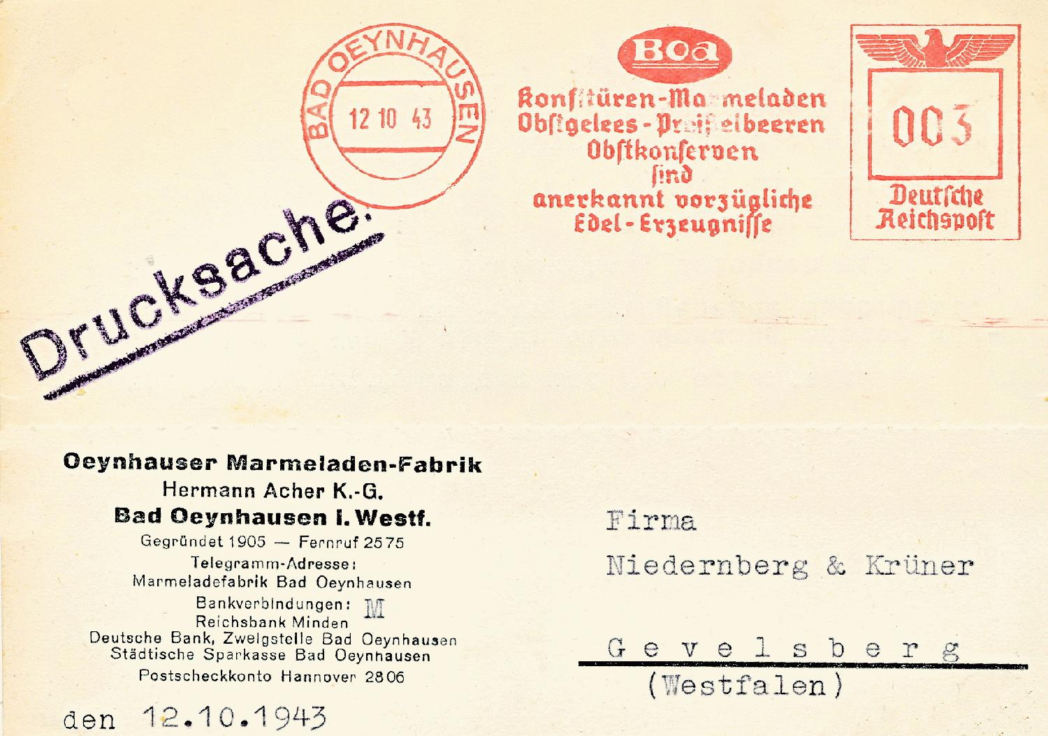 Eine Drucksache der Oeynhauser Marmeladen-Fabrik von der Hermann Acher K.-G. wird vorgestellt.