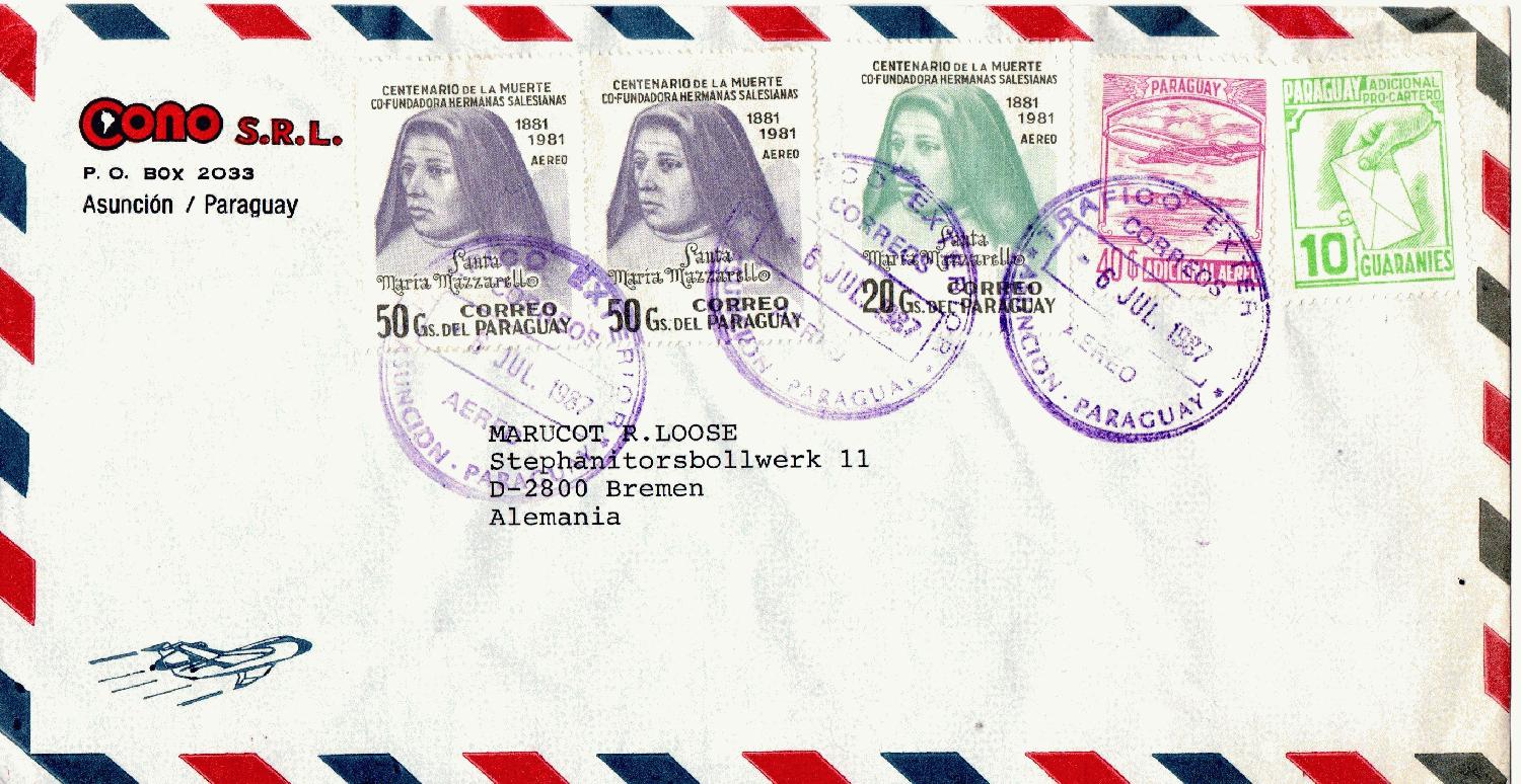 Luftpostbrief vom 06.07.1987 von Asuncion nach Bremen frankiert mit Michel Nr. 2x 3481, 3473 und Zwangszuschlagsmarken Z5 und Z3
