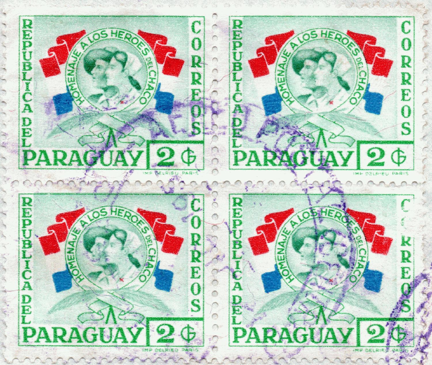 Die 2-Guaranies-Marke zeigt die Inschrift ADICIONAL PRO CARTERO (Google-übersetzt "zusätzlich für Briefträger"), was ich als Zustellgebühr interpretiere. Die Marke trägt eine eingedruckte Nummer, was in mir die Frage aufwirft, ob es denn überhaupt eine Briefmarke ist?
