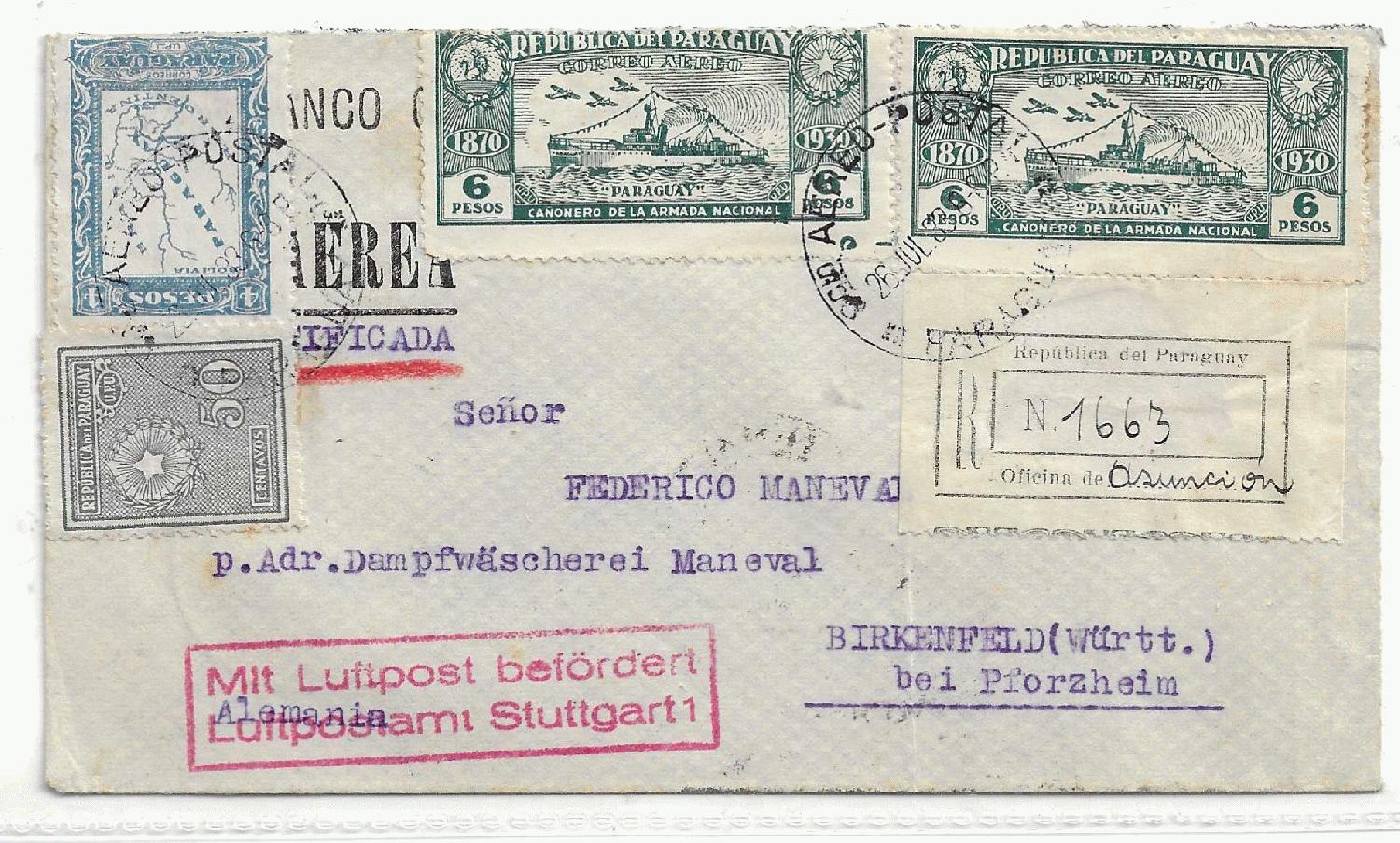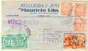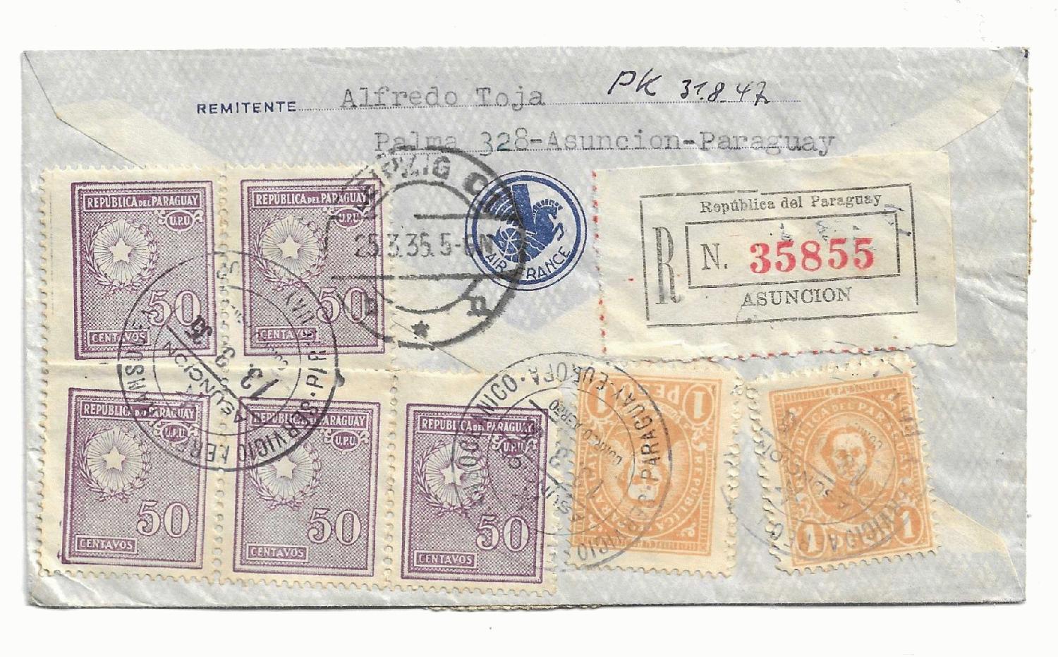 Brief als Einschreiben vom 18.12.1935 aus Asuncion der Hauptstadt von Paraguay, spediert nach Rendsburg in Schleswig Holstein wo der Brief am 27.12.1935 ankam.