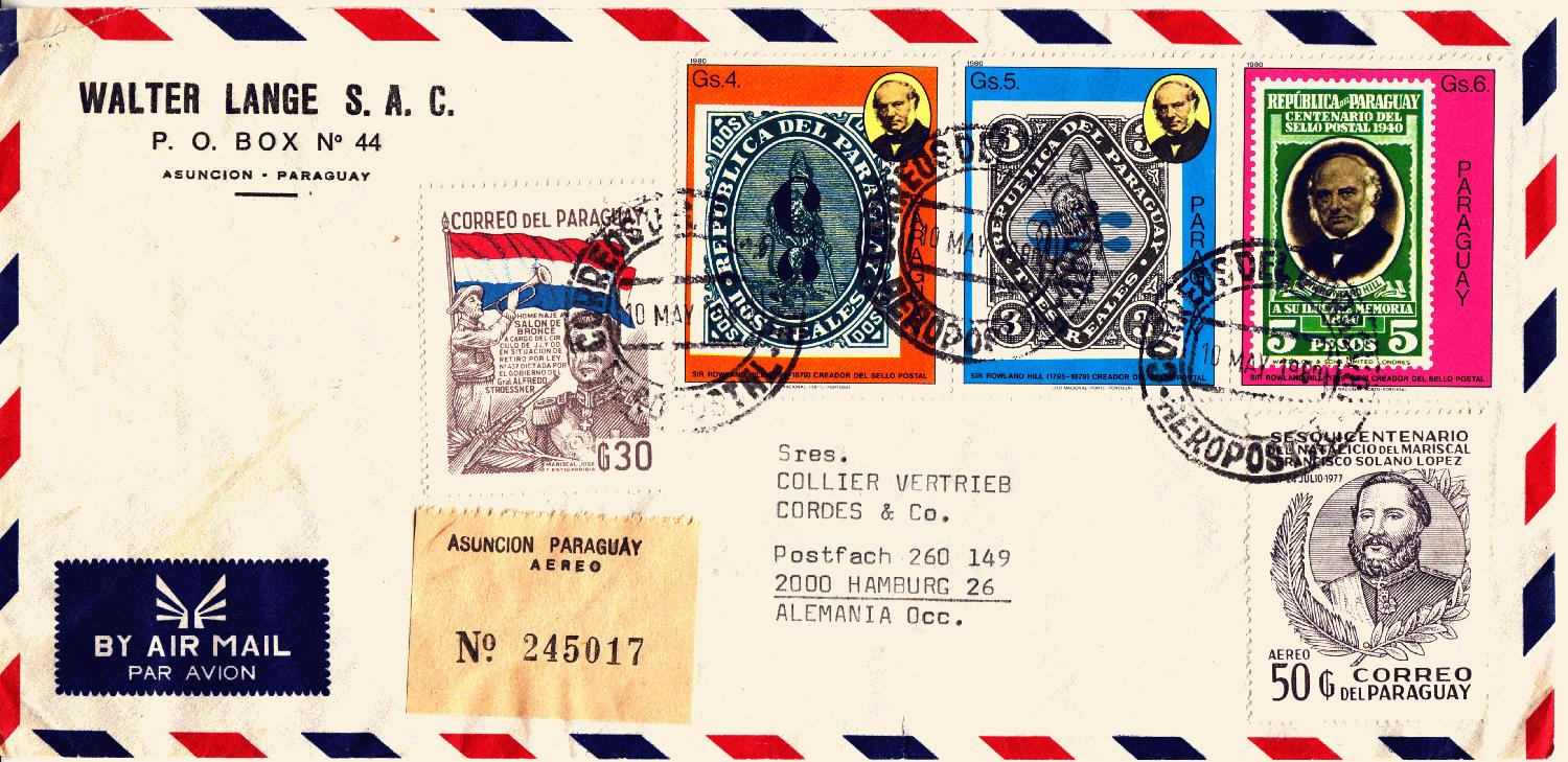 Paraguay hat den Luftpostsammlern wunderschöne Briefe geliefert. Mir fällt auf, dass die meisten bislang gezeigten Briefe aus der Zeit nach dem Zweiten Weltkrieg stammen. Das ist kein Wunder. Die wenigen deutschen Emigranten spielen als Korrespondenten keine große Rolle. Wichtig im Land sind die Kirche und der einheimische Großgrundbesitz. Grund und Boden gehören überwiegend nur Wenigen, ein Großteil der Bevölkerung lebt in Armut unter korrupten Regierungen. Der große Bruder Nordamerika ist sehr zufrieden.