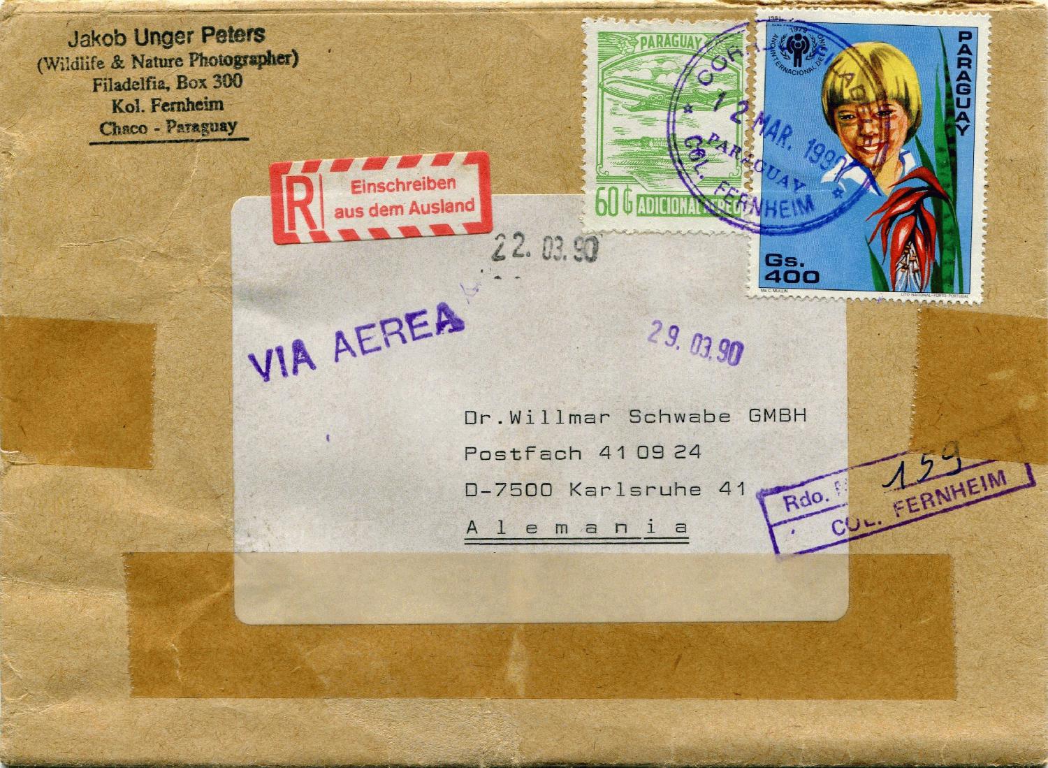 Die Adresse des Absenders ist mit Mbopicua angegeben, dem Hafen am Rio Paraguay, nahe der Kolonie. Vermutlich wurde er dort per Schiff nach Süden in die Hauptstadt Asuncion transportiert, wo er dann das nummerierte Label (R-Label?) erhielt und wohl auch den rückseitigen Stempel vom 18.5.1966.