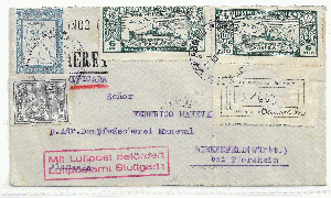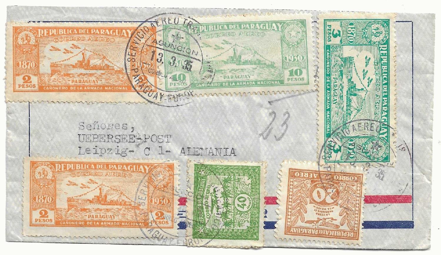 Die beiden zuerst gezeigten Briefe wurden 1933 und 1935 von der Air France nach Deutschland geflogen. Paraguay führte damals einen erfolgreichen Eroberungskrieg gegen das Nachbarland Bolivien.