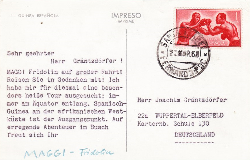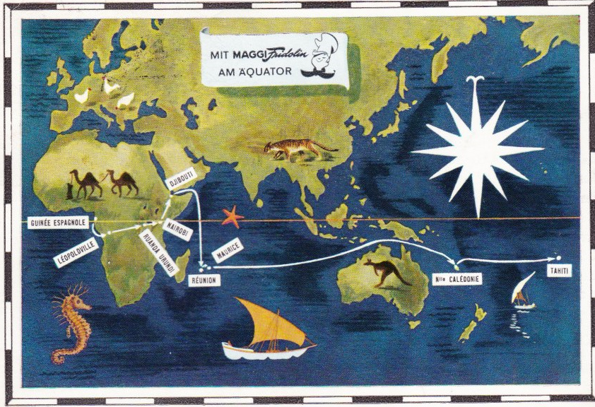 Aus der Maggi-Fridolin-Serie 1960 habe ich alle 9 Karten der Reise und zeige hier die Nr. 1. passend zum Beitrag.
