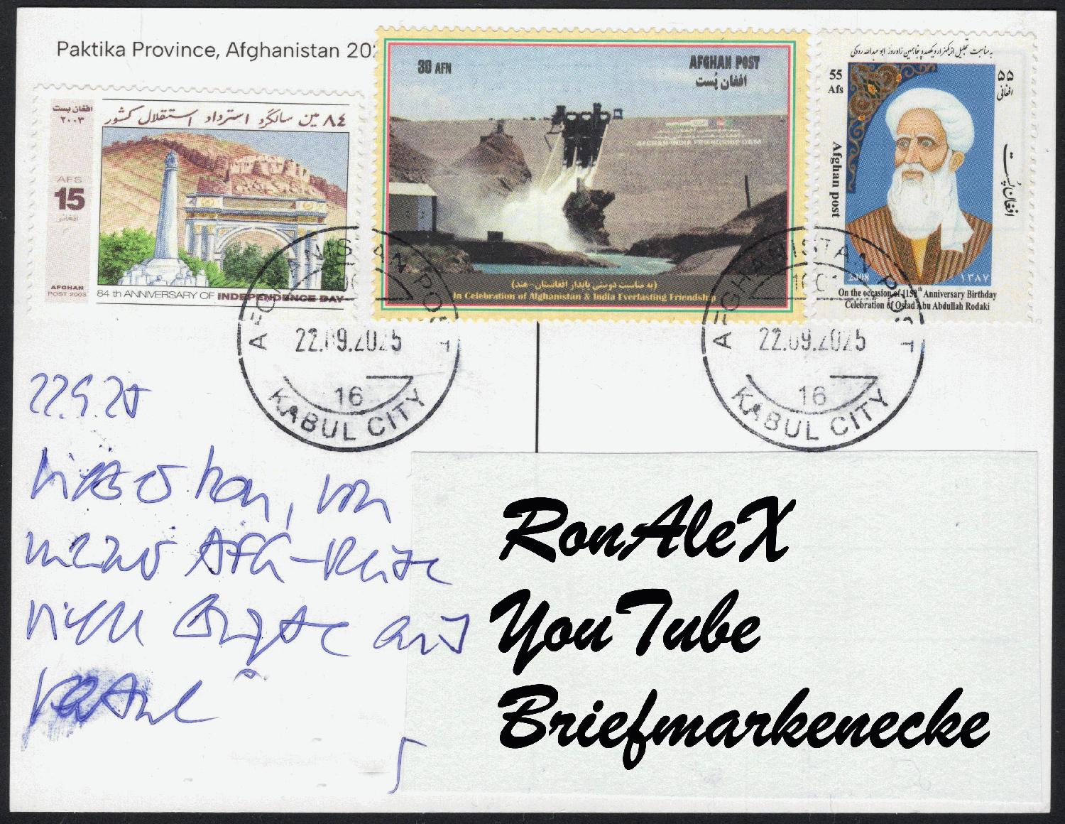 Postkarte aus Afghanistan, abgestempelt am 22. September 2025 in Kabul City, aber nicht gelaufen. Dennoch ein m.E. Eindrucksvolles Poststück, die Rückseite der Postkarte Poste ich nicht, es zeigt Flagge und Kämpfer.