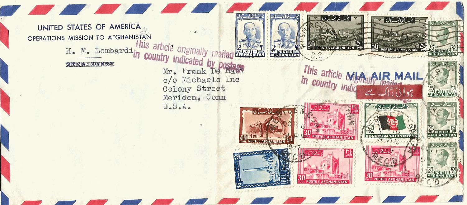 Der Brief, frankiert mit 14 Marken, zu 8,45 Afghani wurde mit Botschaftskurier in die USA verbracht und am 14. Oktober 1957 in Washington aufgegeben.