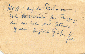 Auf der Rückseite der Karte befindet sich kein geschriebener Text, sondern nur ein großer Stempel, mit dem ich aber nichts anfangen kann. Vielleicht können unsere Rumänienspezialisten da weiterhelfen.