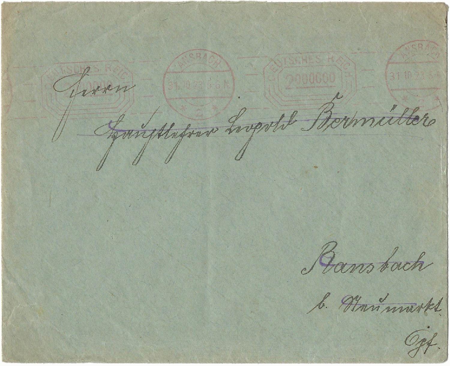 Sendung aus Ansbach nach Ransbach, Bandstempelmaschine Ansbach *2* vom 31.10.1923 (PP21), Portostufe zu 2.000.000 Mk., Stempelfarbe rot