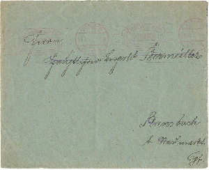 Der erste Maschinen-Ganzstempel mit Werbung ist 1918 in Bayern zum Einsatz gekommen. Gezeigt wird ein Feldpostrückbrief WÜRZBURG-GENT mit dem Slogan "Hilf siegen! Zeichnet Kriegsanleihe!".