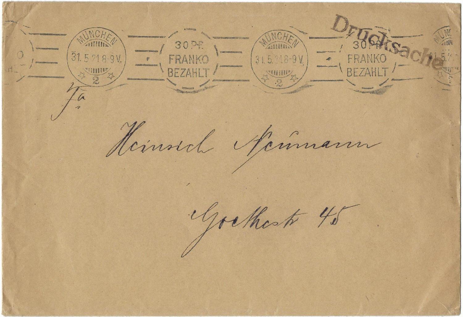 Sendung innerhalb von München, Bandstempelmaschine München *2* vom 31.05.1921 (PP6), Portostufe zu 30 Pf., Stempelfarbe schwarz