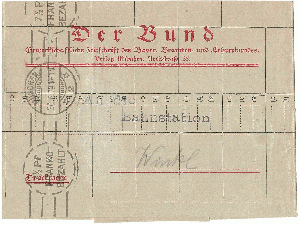 Hierbei handelt es sich über einen nationalisierten Tschechenstempel. Im II. Weltkrieg wurden in besetzten Gebieten die vorhandenen Stempel von den Deutschen verändert und weiter verwendet. Leider liegen mir detaillierte Unterlagen zu diesem Bandstempel aus Prag nicht vor.
