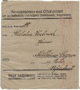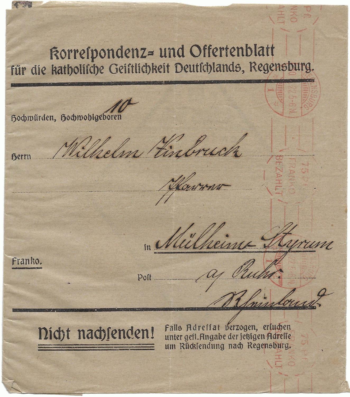 Zeitungsschleife aus Regensburg nach Mülheim (Ruhr), Bandstempelmaschine Regensburg *1* vom 10.07.1922 (PP8), Portostufe zu 75 Pf., Stempelfarbe rot