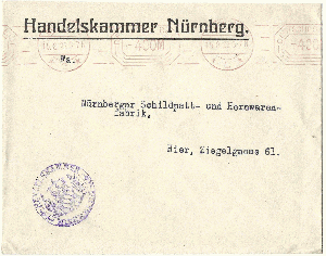 Sendung innerhalb von Nürnberg, Bandstempelmaschine Nürnberg *2* vom 15.08.1923 (PP15), Portostufe zu 400 Mk., Stempelfarbe rot