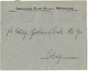 Sendung aus Nürnberg nach Coburg, Bandstempelmaschine Nürnberg *2* vom 22.09.1923 (PP18), Portostufe zu 250.000 Mk., Stempelfarbe rot