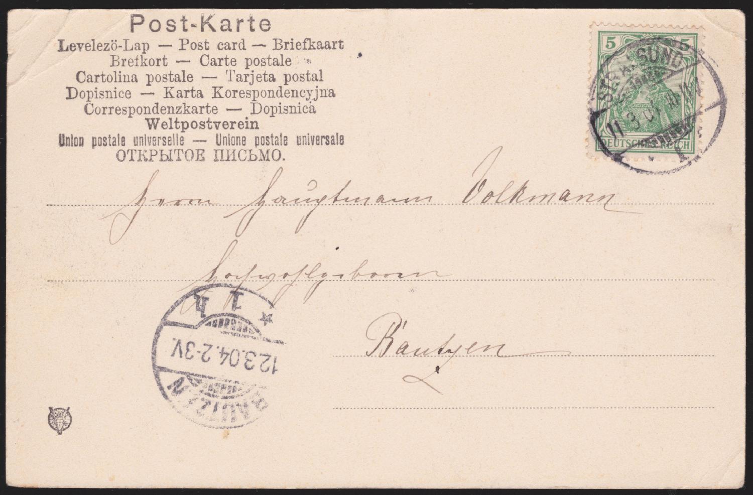 Aus der Heimatsammlung konnte ich bereits eine Karte von Stralsund nach Bautzen vom 11.03.1904 mit passendem Motiv erwerben.